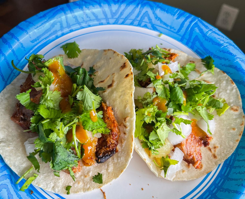 My boyfriend had some of the best and worst tacos he’s ever had when we visited Puerto Rico. When we came back to D.C., he was missing the al pastor ones that changed his life, so he decided to learn how to make his own at home. He slow roasted marinated pork shoulder stacked with pineapple, sliced it up, toasted corn tortillas, added cilantro and sliced onions, and managed to make some super delicious tacos. We live streamed the whole thing on his Twitch, so you can find that here, and follow the recipe below to make your own!